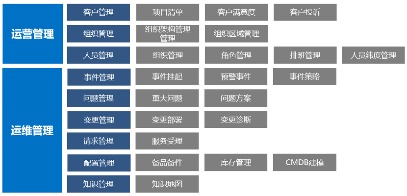 ITPS平台软件是一款全面支持ISO/IEC20000和ITIL各流程与功能以及符合ITSS国家标准的IT服务管理软件。它兼顾了人员、资产、工单(流程)、知识等各关键性要素的整合,是一套面向过程、以客户为中心规范IT部门管理,通过集成IT服务和业务,协助企业提高其IT服务能力的软件平台。ITPS平台软件的功能框架如图所示: